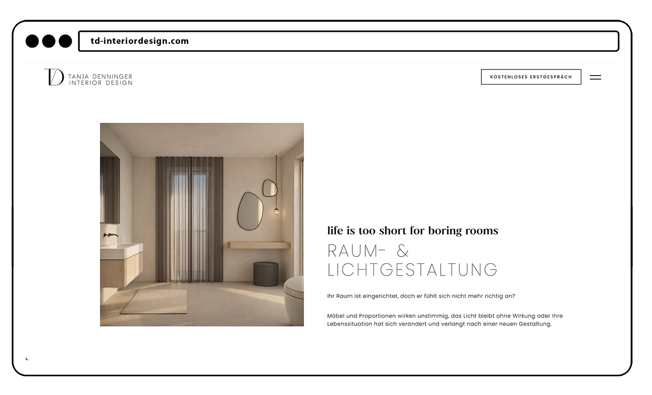 Für die Interior Designerin Tanja Denninger habe ich ihre alte Website umgestaltet und in WordPress umgesetzt. Eine Website, die ihre gestalterische Haltung spürbar macht: klar, modern und auf das Wesentliche reduziert – dabei aber immer warm und einladend.