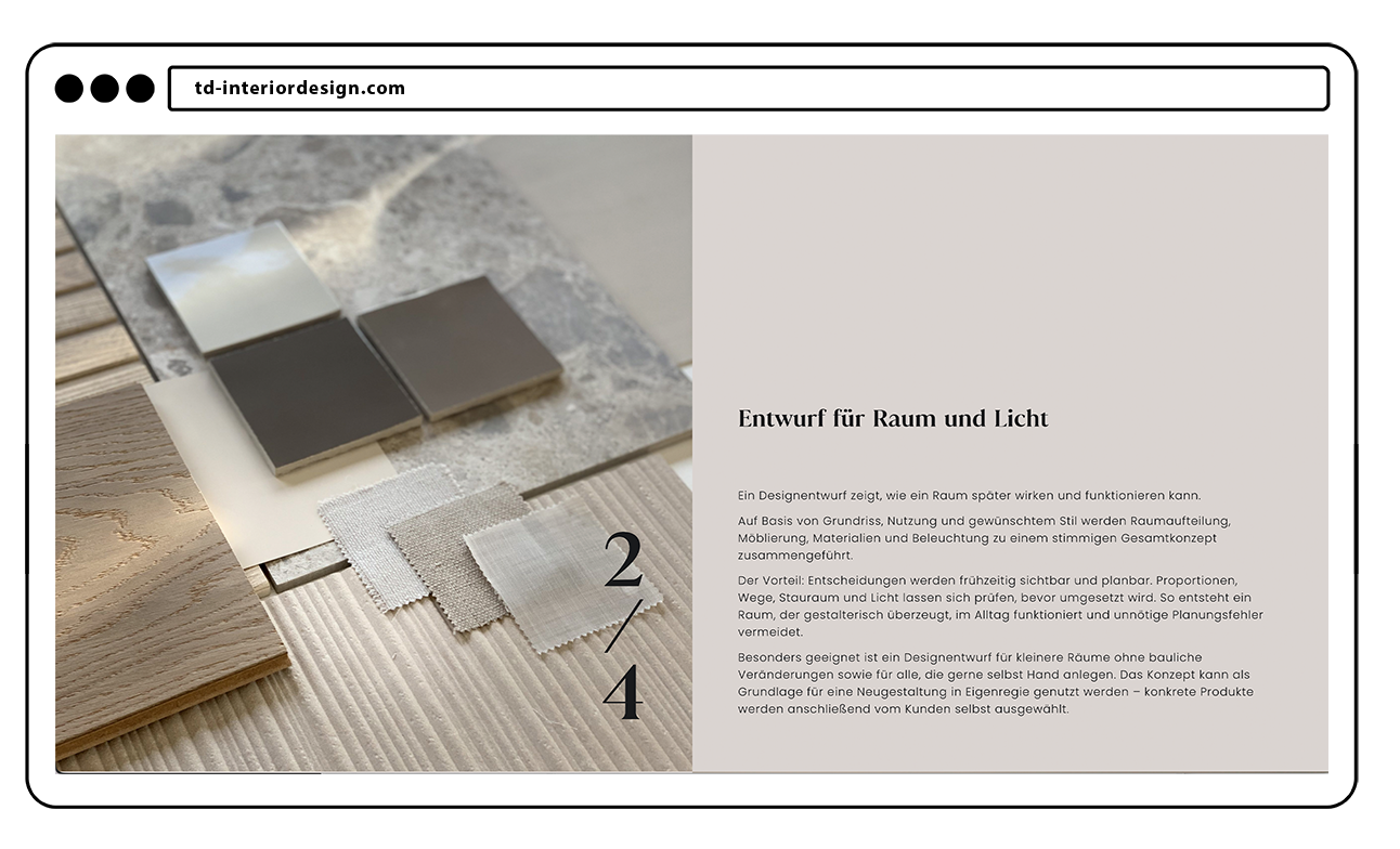 Das reduzierte Design lenkt nicht ab, sondern schafft Raum für das Wesentliche und unterstreicht die Präzision und Qualität, für die Tanja Denninger steht. Entdecke die Website hier: td-interiordesign.com